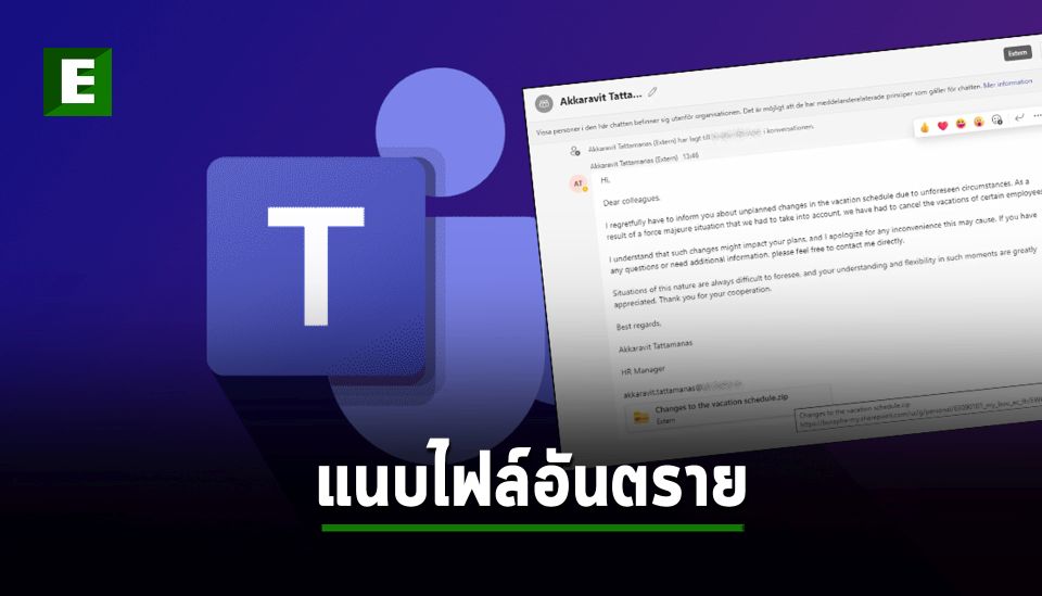 นักวิจัยจาก Truesec รายงานพบบัญชี Microsoft 365 2 รายการ โดนแฮ็กให้ส่งข้อความหลอกว่ามาจาก HR แต่แถมไฟล์แนบอันตรายมาด้วย ข้อความเหล่านี้อ้างตรงกันว่ามีการเปลี่ยนตารางวันหยุด อยากให้เข้ามาดูกัน